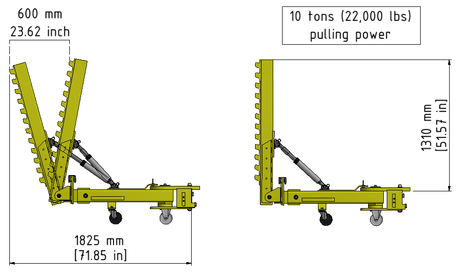 The optional P20 Vector Pulling Set expands the P10’s multifunctionality by adding one or more hydraulic cylinders equipped with an integrated chain holder. In addition, the pulling arm is extendable by 87.5 cm using the optional P3030 Arm Extension. Combined with the D10 Down Pull Adapter, virtually each convenient angle is attainable, which allows for unparalleled flexibility and ease-of-use.